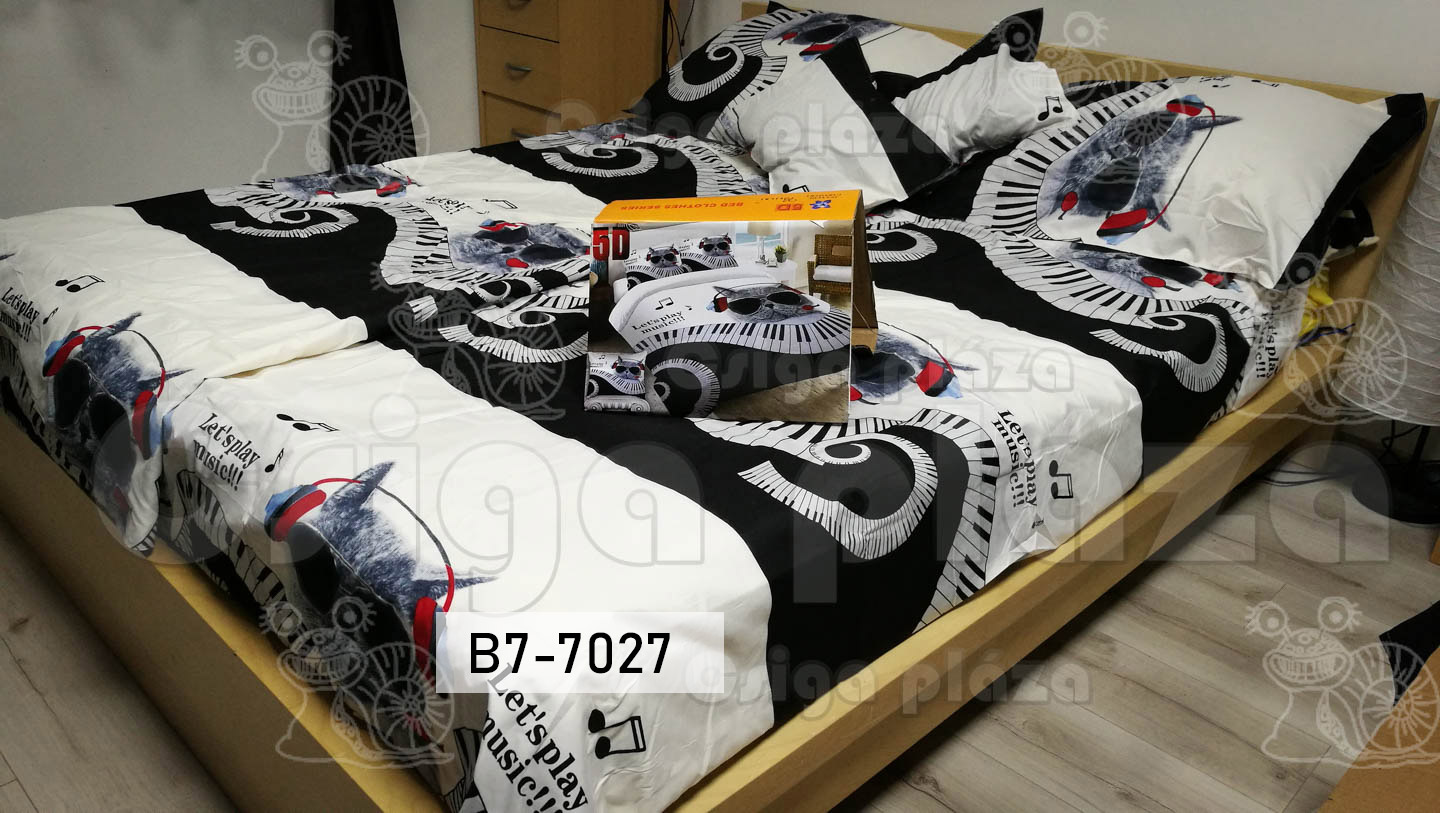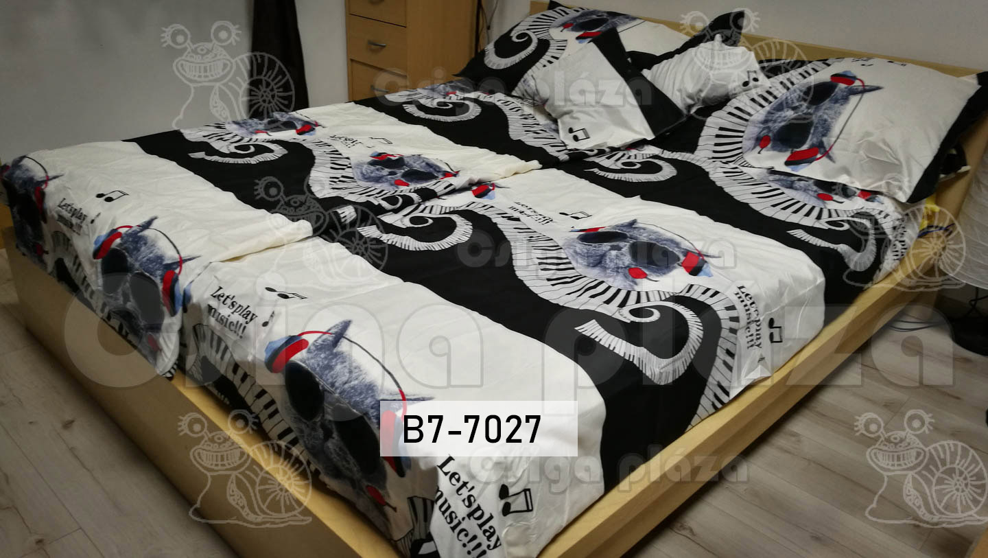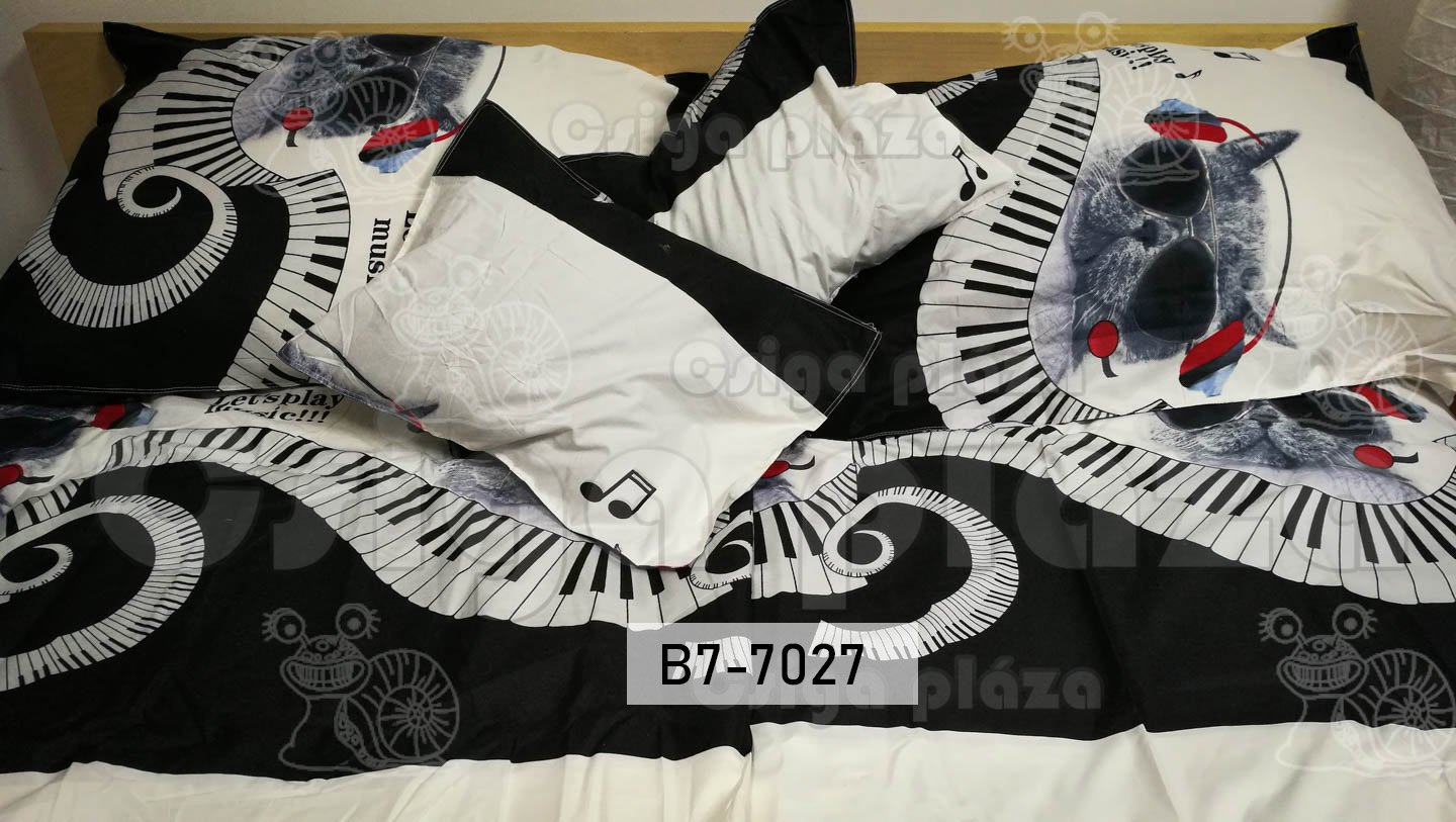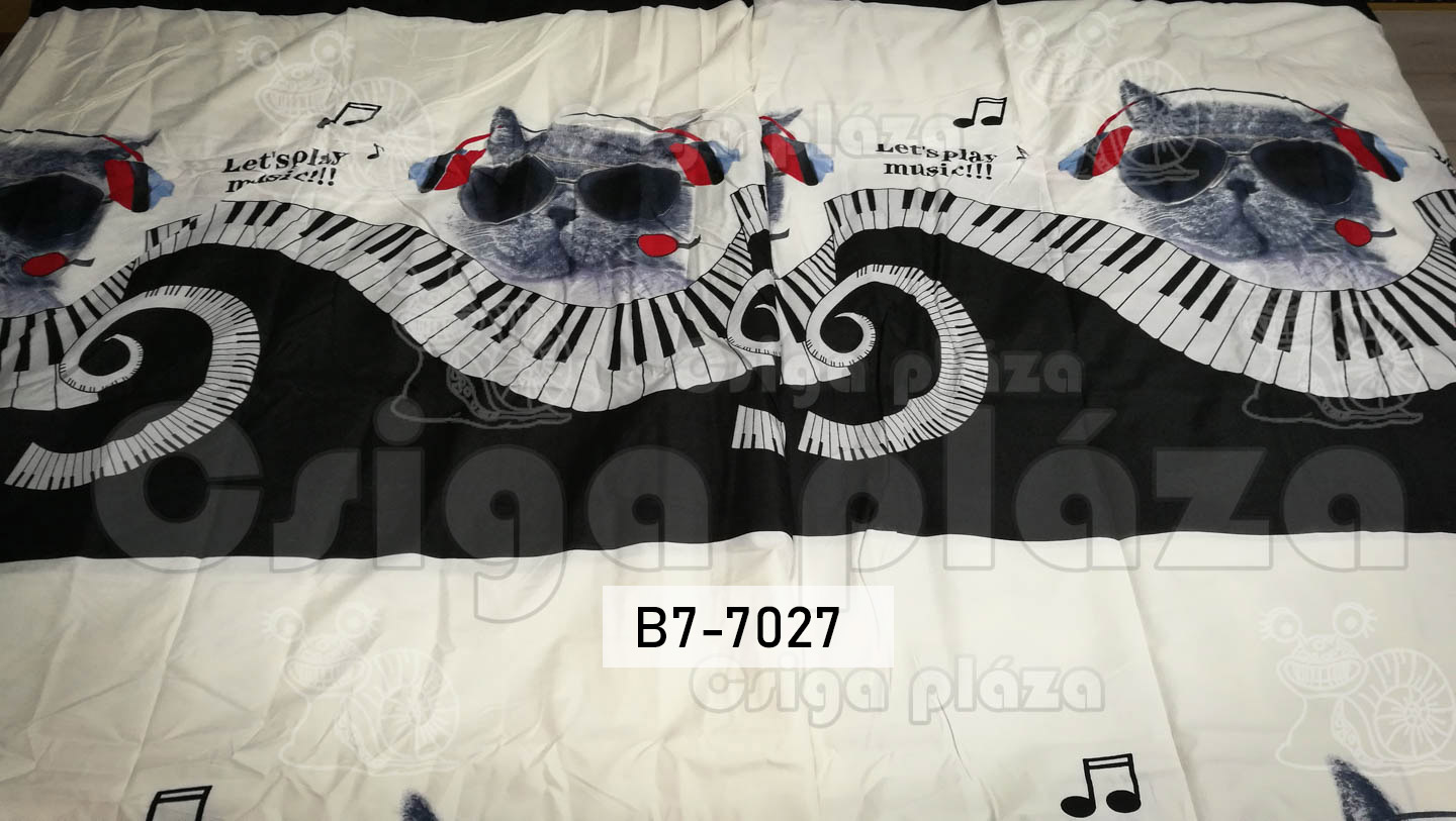Zenélő macska 7 részes ágynemű garnitúra. Fülhallgató, és billentyűzet látható a cicán illetve mellette. 100% pamut.