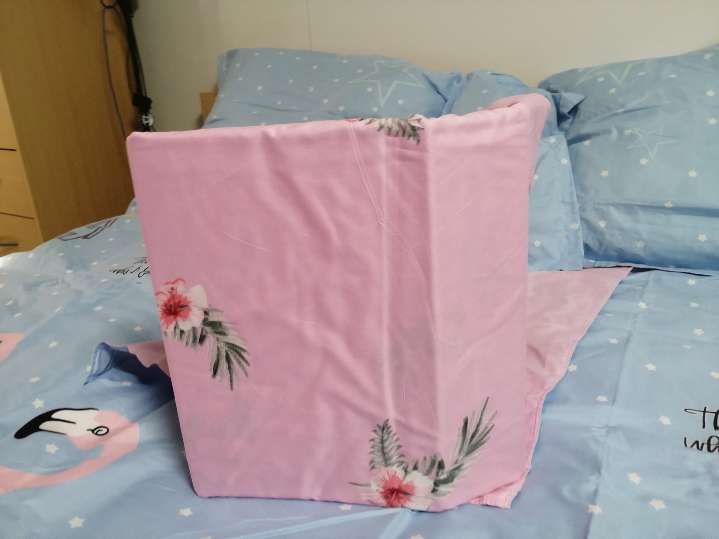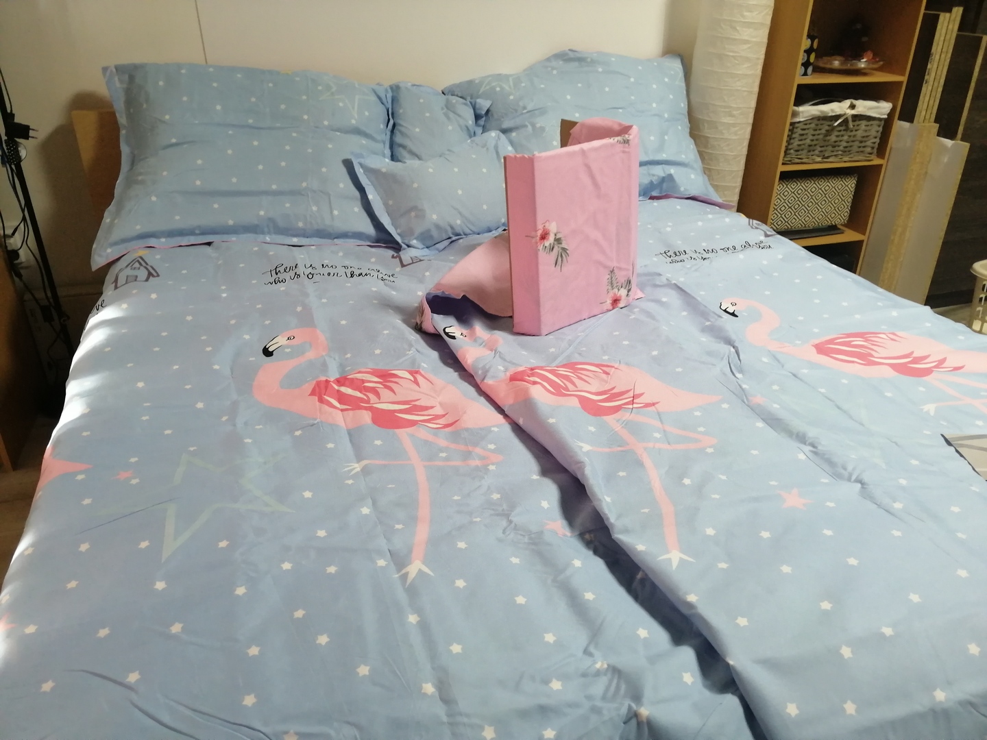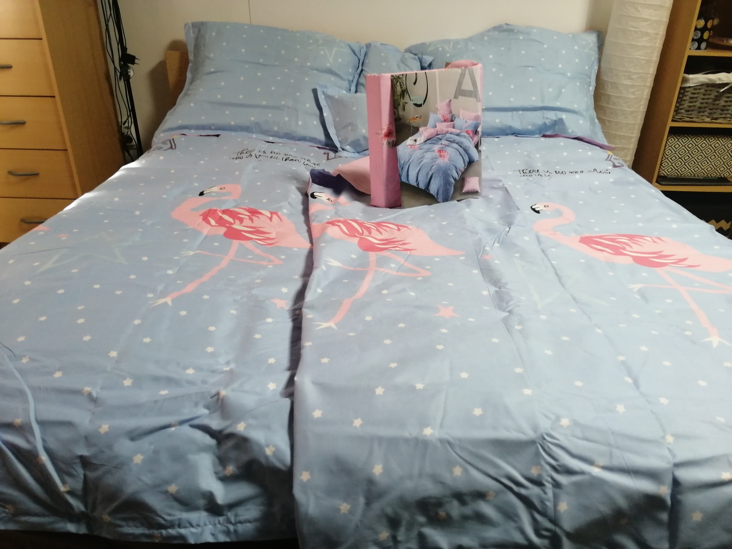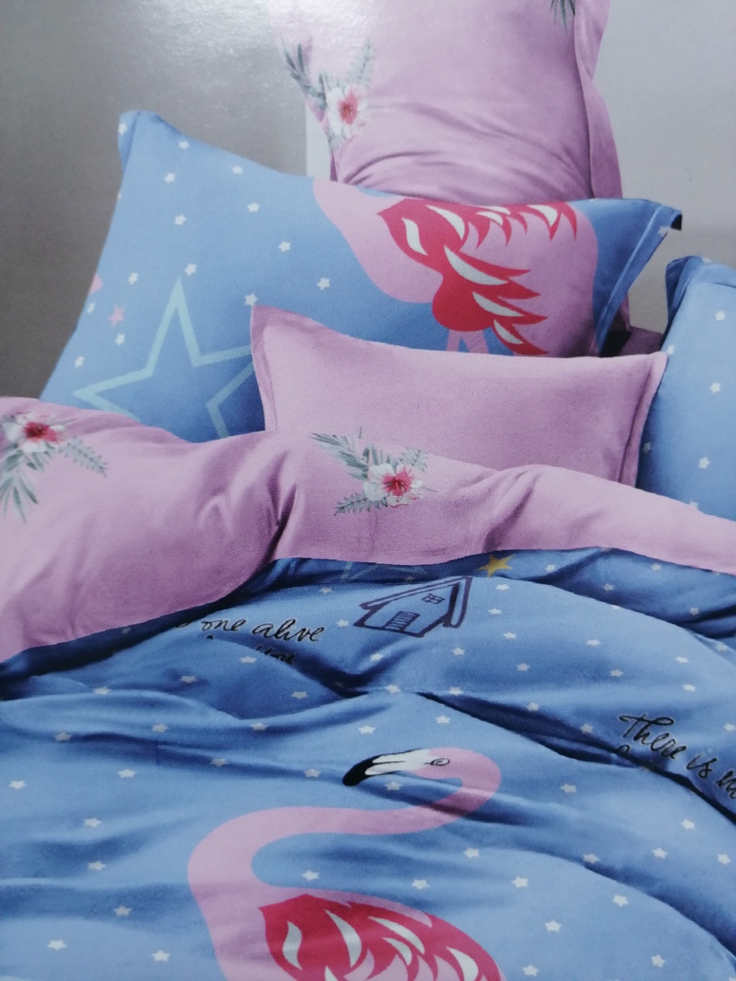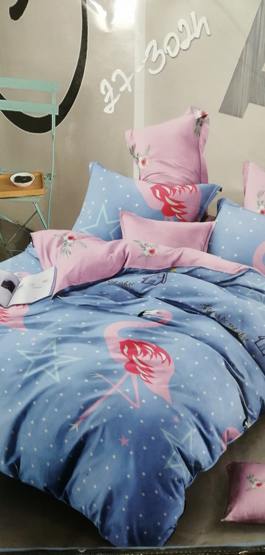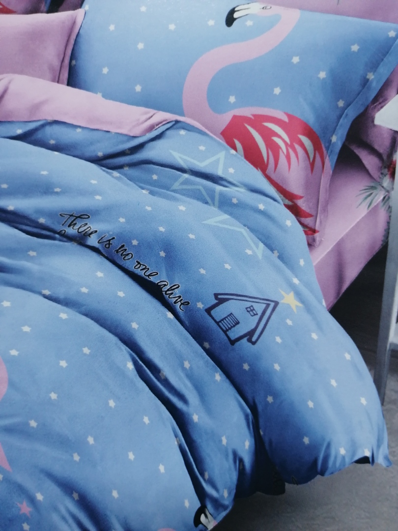 Világoskék rózsaszín flamingós 7 részes ágynemű garnitúra. 100% pamut.
