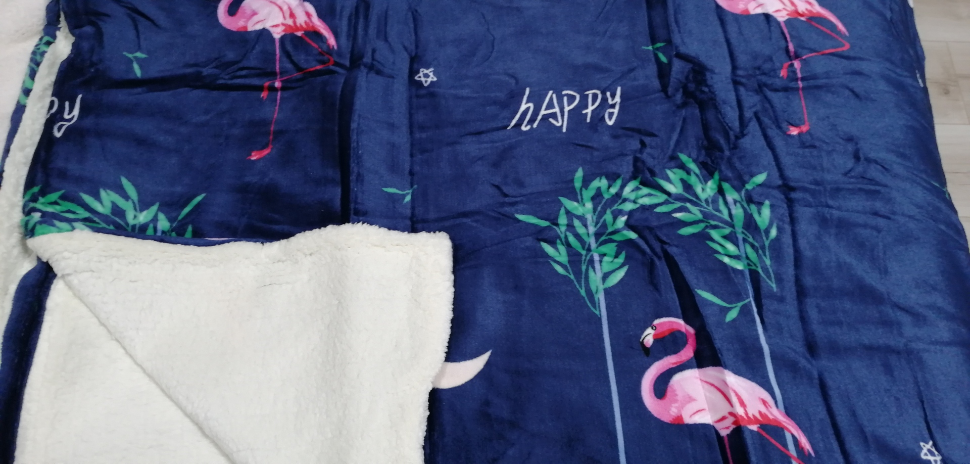 Középkék happy flamingós 150*200 cm sherpa pléd, bundás takaró